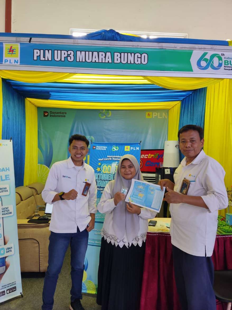 Muara Bungo >> Menyemarakkan peringatan Hari Ulang Tahun (HUT) ke-60 Kabupaten Bungo dengan semangat jelang Hari Pahlawan, PT PLN (Persero) Unit Pelaksana Pelayanan Pelanggan (UP3) Muara Bungo tampil aktif dalam ajang Bungo Expo 2025 di kawasan Ex Lapangan MTQ Baru Muara Bungo. Tak sekadar berpartisipasi, PLN hadir membawa semangat inovasi dengan menghadirkan promo tambah daya listrik hingga 50% dan berbagai layanan digital unggulan untuk masyarakat yang dapat dimanfaatkan untuk bebagai kegiatan dalam memperingati Hari Pahlawan.