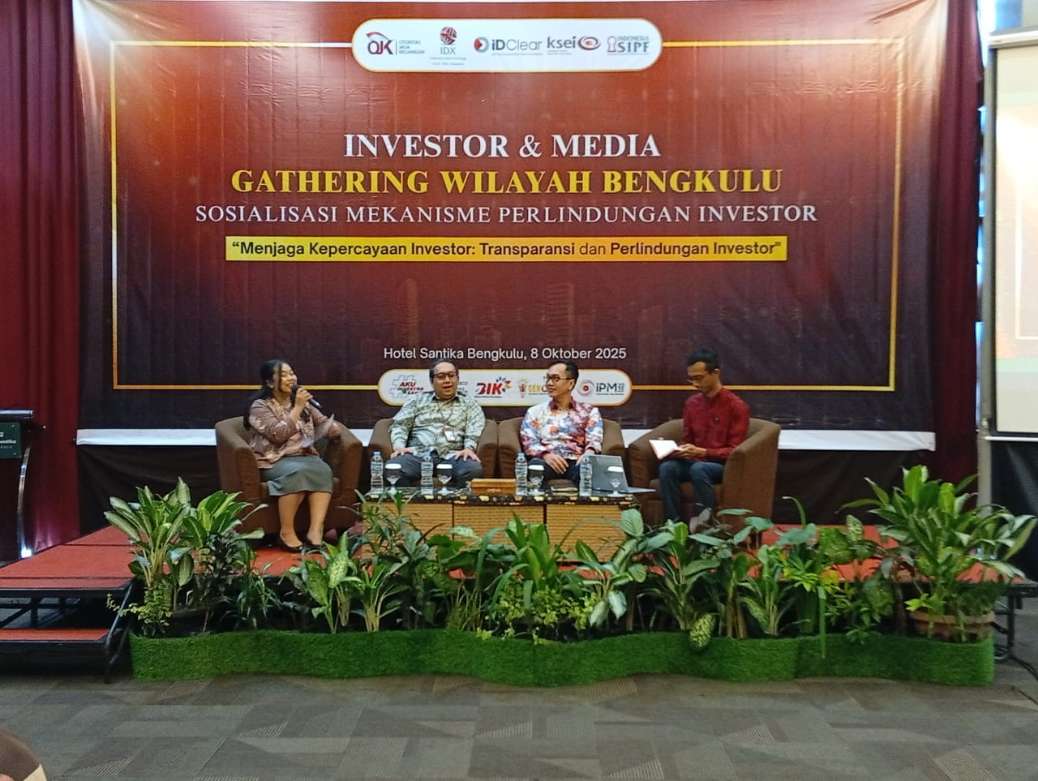 Untuk itu kolaborasi yang kuat antara BEI, KPEI, KSEI, dan SIPF berjalan sesuai regulasi yang ditetapkan OJK. Untuk memahami alur dan mengenal lebih dekat beberapa instansi terkait dengan bursa saham gelar kegiatan Investor & Media Gathering Wilayah Bengkulu, dengan Tema Sosialisasi Mekanisme Perlindungan Investor: “Menjaga Kepercayaan Investor: Transparansi dan Perlindungan Investor”, di Ballroom Hotel Santika Bengkulu, Rabu (08/10/2025).